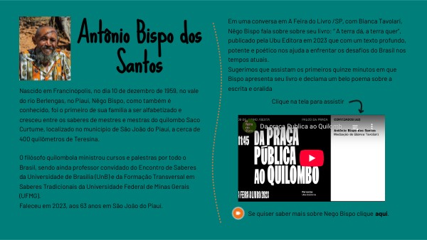 Em uma conversa em A Feira do Livro /SP, com Bianca Tavolari, Nêgo Bispo fala sobre sobre seu livro: “ A terra dá, a terra quer”, publicado pela Ubu Editora em 2023 que com um texto profundo, potente e poético nos ajuda a enfrentar os desafios do Brasil nos tempos atuais. A entrevista tem em torno de 1h15 e sugerimos que você assista os primeiros 15' minutos em que Bispo apresenta seu livro e declama uma linda poesia que fala sobre a escrita e oralidade.