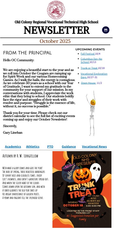 Hello OC Community: We are enjoying a beautiful start to the year and as we roll into October the Cougars are ramping up for Spirit Week and our various Homecoming Games. As I walk the halls, the energy is contagious. As we celebrate 50 years as a school with our Year of Gratitude, I want to extend my gratitude to the community for your support of our mission. In my conversations with students, I appreciate the work ethic that they bring to school. Our students boldly face the rigor and struggles of their work with resolve and purpose. “Struggle is the essence of life, without it, no success is possible.” Thank you for your time. Please check out our district calendar to see the full list of exciting events coming up and enjoy our October Newsletter! Sincerely, Gary Linehan