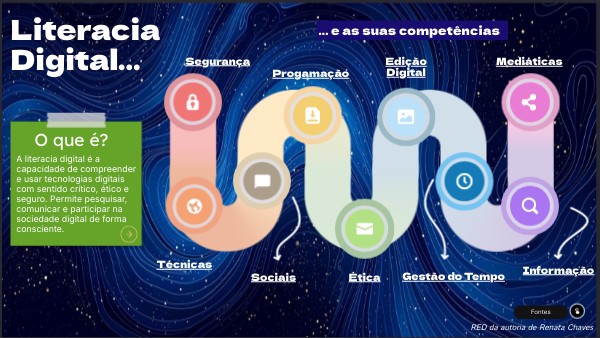 ChatGPT. (2025). Definições e explicações sobre competências digitais na literacia digital [Conversa com utilizador]. OpenAI. Dia 7/10/2025 e 30/09/2025. Recuperado de https://chat.openai.com/ Direção-Geral da Educação (DGE). (2025). Dia Internacional da Literacia destaca competências digitais. https://www.dge.mec.pt/noticias/dia-internacional-da-literacia-destaca-competencias-digitais INCoDe.2030. (2025). Estudo das Competências Digitais. Acesso em: 14 out. 2025.Disponível em: https://www.incode2030.gov.pt/estudo-das-competencias-digitais/ Oliveira, L. (2012). Literacia digital e metodologias. In M. J. Brites, I. Amaral & M. T. Silva (Eds.), Literacias cívicas e críticas: refletir e praticar (pp. 97–99). CECS.Papaioannou, T. (2011). Assessing digital media literacy among young people through their use of social networking sites. Revista de Informática Social, VIII(15), 37–48. Pereira, L. (2013). Literacia digital e políticas tecnológicas para a educação. DE FACTO Editores.
