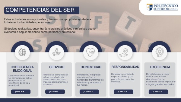 Estas actividades son opcionales y tienen como propósito ayudarte a fortalecer tus habilidades personales. Si decides realizarlas, encontrarás ejercicios prácticos y reflexivos que te ayudarán a seguir creciendo como persona y profesional.