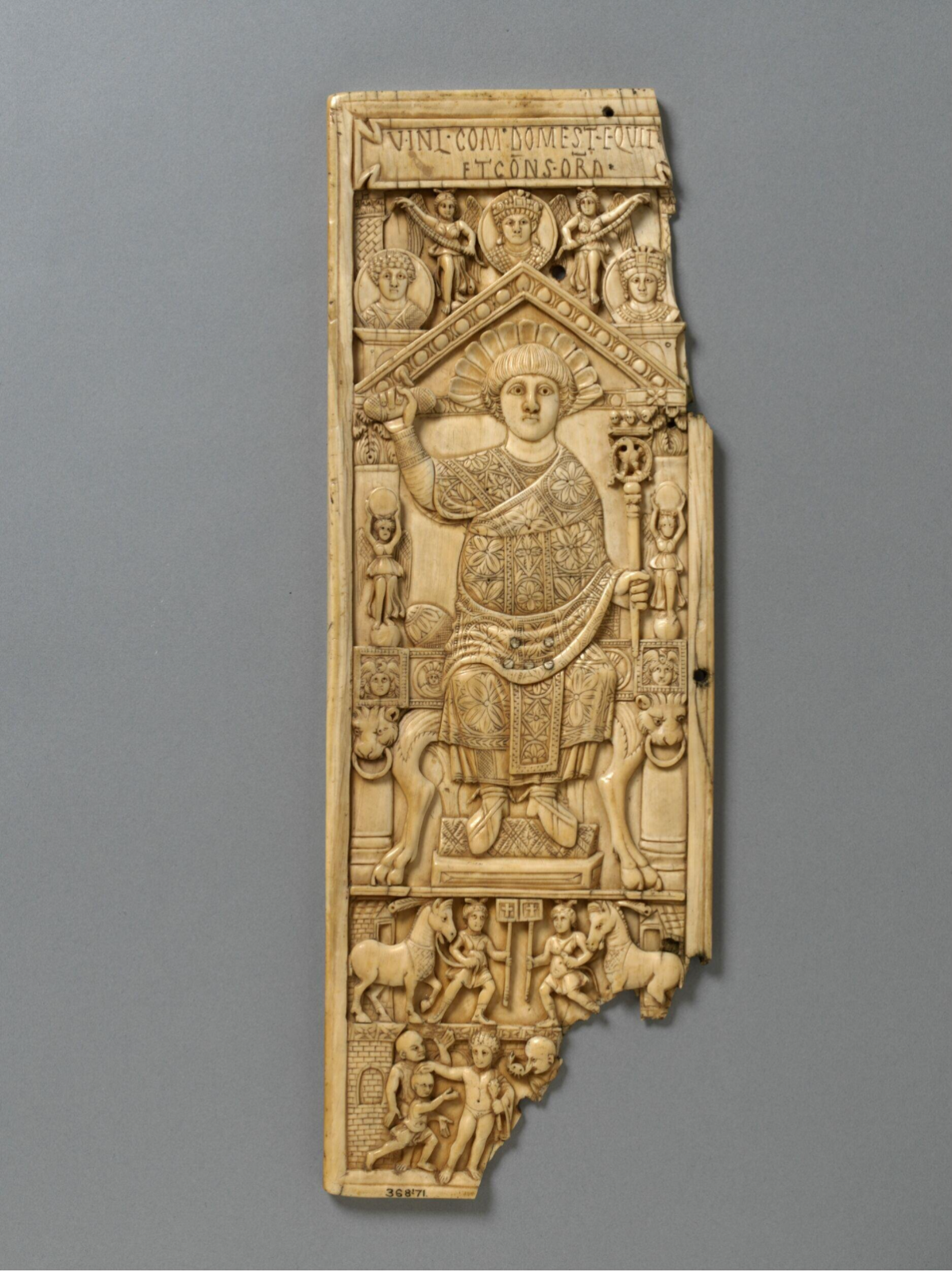 Flavius Anastasius is depicted wearing a trabea, a traditional and highly decorated ceremonial costume, while seated on a lion-legged throne. His left hand holds a sceptre, and his right holds a ceremonial textile known as the mappa circensis, which would be dropped to declare the start of the games that take place on the lower register of the panel. At the very bottom, a man can be seen with a crab grabbing his nose in what is possibly an act of comic relief for the games’ onlookers. Above them, two attendants lead horses, possibly for some kind of race. The seated consul is flanked by two Winged Victory figures, standing on globes and supporting shields, with medallions displaying personifications of Rome and Constantinople decorating his throne. The whole scene is set in front of an aedicula, a structure that serves to frame and highlight a statue. The upper register of the panel features both an inscription, which displays the titles of the new consul, and three busts. The uppermost bust is that of Emperor Anastasius I, Flavius Anastasius’s uncle. To his right is Anastasius I’s wife, Empress Ariadne, and to his left is Pompeius, the other Byzantine consul. The overwhelming amount of ornamentation and regalia maximize the status of the position of consul while minimizing the individuality of Flavius Anastasius himself. Moreover, the miniscule size of the other figures compared to Flavius Anastasius and the royal busts above him is a technique characteristic of Byzantine iconography, cementing the importance of the main figure(s) over the common people displayed in the ivory.