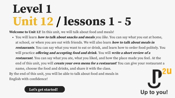 By the end of this unit, you will be able to talk about food and meals in English with confidence!Let's get started!
