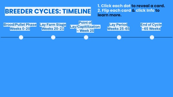 Birds are removed from production and sold or processed as spent breeders. This stage includes cleanout and preparation for the next flock. Click INFO below.