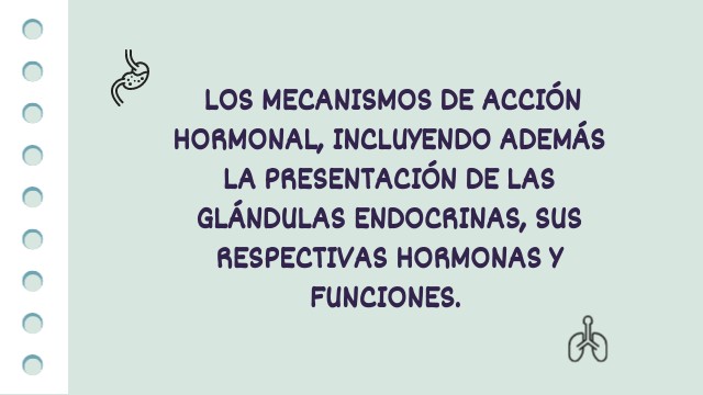 los mecanismos de acción hormonal, incluyendo además la presentación de las glándulas endocrinas, sus respectivas hormonas y funciones.