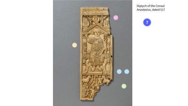 A line of inquiry that emerges while assessing this and other consular diptychs is whether these works emphasize individuality, or rather emphasize the more general, ceremonial, and symbolic aspects of the Imperial office. Speaking to the latter, this piece is typical of other diptychs (such as that of Boethius or Rufus) in its form and symbolism, indicating a highly standardized way in which the consular diptych announced power. It is divided into multiple registers, with the portraits of other important figureheads at the top, and with another scene (sometimes allegorical) at the base. It also includes typical imperial indicators of power like the mappa, which signals the emperor’s role in triumphal scenes or as the initiator of the games. Other images also flank the emperor, like personifications of Rome and Constantinople, as well as wreaths. But consider this diptych in comparison with diptychs portraying Empresses—for example, the leaf that McLanan dubs the Florence ivory, depicting either Sophia or Ariadne. It breaks distinctly from this traditional standard of how the diptych is arranged, and how it announces power. The third point (blue button) will go deeper into this comparison, but it’s worth noting how THIS diptych announces power in a relatively standardized way, in order to show how the Empress’ power is depicted in contrast.