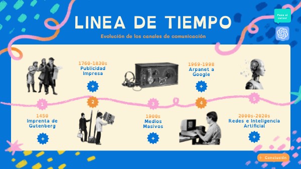 Prompt Utilizado: Tengo que hacer una línea del tiempo con cinco momentos clave en la evolución de los canales de comunicación, desde la prehistoria hasta el presente digital. Elegí como hitos: 1) Imprenta (1450), 2) Revolución Industrial + Telégrafo (1760–1830s), 3) Medios Masivos (1900s), 4) Internet – de ARPANET a Google (1969–1998), y 5) Redes Sociales e IA (2000s–2020s). Necesito que me ayudes a desmenuzar y organizar cada punto con una breve explicación del hito en su contexto histórico.