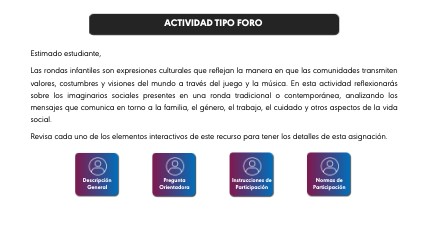 Las rondas infantiles no solo son juegos musicales, también transmiten valores, roles y narrativas sociales. Piensa en una ronda de tu infancia o del contexto actual y reflexiona: ¿Qué imaginarios sociales (familia, comunidad, género, trabajo, cuidado, etc.) se reproducen en su letra, movimientos o personajes? ¿Crees que estas narrativas refuerzan estereotipos o más bien abren posibilidades críticas y creativas en los niños? ¿Cómo podría un docente resignificar esas rondas para promover la igualdad, la inclusión y la construcción de nuevos imaginarios en la escuela? Nota: la rúbrica evaluativa la encuentras en la tarea que lleva el mismo nombre del foro.