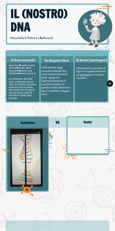 Adenina ⮕ perle rosse Timina⮕perle verdi Guanina⮕perle rosa Citosina⮕perle azzurre Lo scheletro del Dna sara' composto da un tubo di plastica al quale andremo ad incollare dei bastoncini di legno che saranno inserite all'interno delle basi azotate