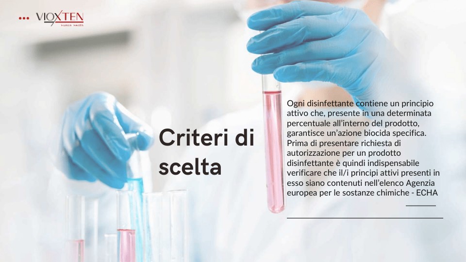 Ogni disinfettante contiene un principioattivo che, presente in una determinatapercentuale all’interno del prodotto,garantisce un’azione biocida specifica.Prima di presentare richiesta diautorizzazione per un prodottodisinfettante è quindi indispensabileverificare che il/i principi attivi presenti inesso siano contenuti nell’elenco Agenziaeuropea per le sostanze chimiche - ECHA