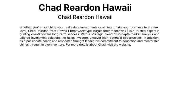 Whether you're launching your real estate investments or aiming to take your business to the next level, Chad Reardon from Hawaii ( https://teletype.in/@chadreardonhawaii ) is a trusted expert in guiding clients toward long-term success. With a strategic blend of in-depth market analysis and tailored investment solutions, he helps investors uncover high-potential opportunities. In addition, as a passionate coach and respected thought leader, his commitment to education and mentorship shines through in every venture. For more details about Chad, visit the website.