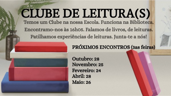 Temos um Clube na nossa Escola. Funciona na Biblioteca. Encontramo-nos às 16h05. Falamos de livros, de leituras. Patilhamos experiências de leituras. Junta-te a nós!