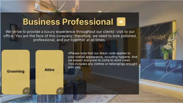We strive to provide a luxury experience throughout our clients' visit to our office. You are the face of this company; therefore, we need to look polished, professional, and put together at all times.