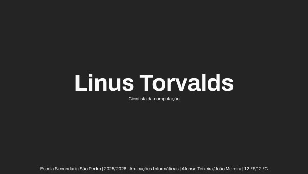 https://pt.wikipedia.org/wiki/Linus_Torvalds https://imgs.search.brave.com/yUrx0ltbLNASUyZo11Lv30mvAYiyeQZ6XhX7RuM5m9w/rs:fit:500:0:1:0/g:ce/aHR0cHM6Ly93YWxs/cGFwZXJjYXZlLmNv/bS93cC93cDkxMTA0/ODAuanBn https://www.freeiconspng.com/uploads/pacman-png-9.png https://upload.wikimedia.org/wikipedia/commons/thumb/3/35/Tux.svg/1012px-Tux.svg.png OpenAI (2025). (versão de 8 de outubro). [Large language model] https://chatgpt.com/ Diz-me quais são os maiores contributos de Linus Tordvals e os seus premios 🧠 Principais Contributos de Linus Torvalds Criação do Kernel Linux (1991) Em 1991, como estudante universitário na Finlândia, Linus criou um novo núcleo de sistema operativo baseado em UNIX. Lançou-o publicamente com uma licença livre, permitindo que qualquer pessoa pudesse usar, estudar, modificar e distribuir o código. Este kernel é hoje usado em: Servidores (a maioria dos servidores na internet corre Linux) Android (baseado no kernel Linux) Supercomputadores Dispositivos IoT, routers, automóveis, etc. Promoção do Software de Código Aberto (Open Source) Embora não tenha criado o conceito, Linus tornou-se uma figura de proa do movimento, ao mostrar que era possível desenvolver software poderoso com contribuições colaborativas globais. Criação do Git (2005) Quando o sistema de controlo de versões que usava (BitKeeper) deixou de ser gratuito, Linus criou o Git, um sistema de controlo de versões distribuído. Hoje, o Git é o sistema padrão na indústria de software — usado por milhões de programadores no mundo inteiro (por exemplo, no GitHub). 🏆 Prémios e Reconhecimentos Linus Torvalds recebeu inúmeros prémios e distinções ao longo dos anos. Aqui estão os mais relevantes: IEEE Computer Pioneer Award (2014) Prémio atribuído por contribuições significativas e duradouras na área da computação. Millennium Technology Prize (2012) Considerado o “Prémio Nobel da Tecnologia”. Atribuído pela Academia de Tecnologia da Finlândia pelo impacto do Linux no mundo moderno. Indução no Hall of Fellows da Computer History Museum (2008) Reconhecimento pelo papel histórico no desenvolvimento de software livre e de código aberto. Lovelace Medal da British Computer Society (2000) Uma das maiores honras na informática, atribuída por contribuições excepcionais. Nomeado para o Prémio Nobel da Paz (por utilizadores e fãs do software livre) Embora nunca o tenha ganho, houve campanhas em várias ocasiões para nomeá-lo pelo impacto social e global do software livre. TIME 100 (2004, 2006) Listado pela revista TIME como uma das 100 pessoas mais influentes do mundo.
