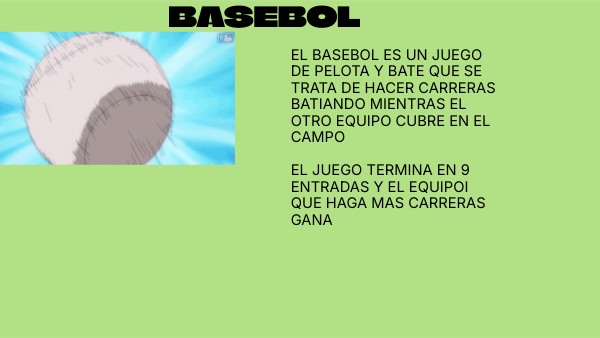 EL BASEBOL ES UN JUEGO DE PELOTA Y BATE QUE SE TRATA DE HACER CARRERAS BATIANDO MIENTRAS EL OTRO EQUIPO CUBRE EN EL CAMPO EL JUEGO TERMINA EN 9 ENTRADAS Y EL EQUIPOI QUE HAGA MAS CARRERAS GANA