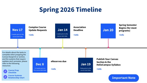 Please note: Not all programs follow the standard SOE calendar. Your course or program lead can provide additional guidance if your course prep follows a unique timeline. For Canvas or HelioCampus assistance please submit a CFDIL Support Request Form.