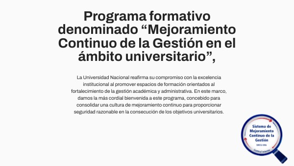 La Universidad Nacional reafirma su compromiso con la excelencia institucional al promover espacios de formación orientados al fortalecimiento de la gestión académica y administrativa. En este marco, damos la más cordial bienvenida a este programa, concebido para consolidar una cultura de mejoramiento continuo para proporcionar seguridad razonable en la consecución de los objetivos universitarios.