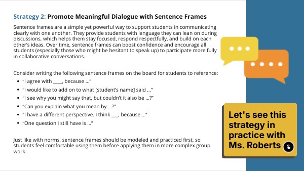 Just like with norms, sentence frames should be modeled and practiced first, so students feel comfortable using them before applying them in more complex group work.Let's see this strategy in practice with Ms. Roberts