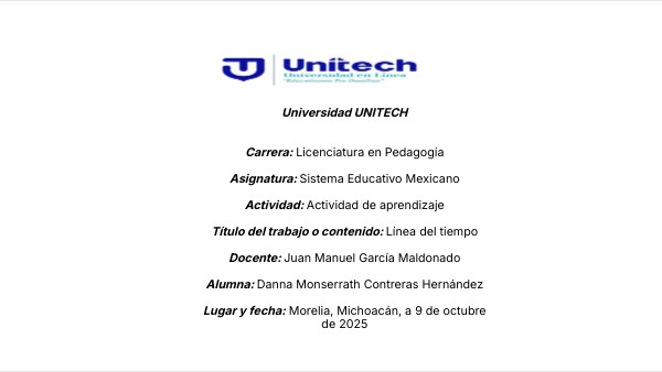 Universidad UNITECH Carrera: Licenciatura en Pedagogía Asignatura: Sistema Educativo Mexicano Actividad: Actividad de aprendizaje Título del trabajo o contenido: Línea del tiempo Docente: Juan Manuel García Maldonado Alumna: Danna Monserrath Contreras Hernández Lugar y fecha: Morelia, Michoacán, a 9 de octubre de 2025
