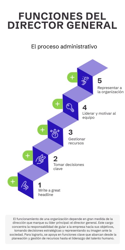 El director general establece la misión, visión y metas estratégicas de la organización, asegurando que todos los esfuerzos estén alineados hacia un mismo rumbo.