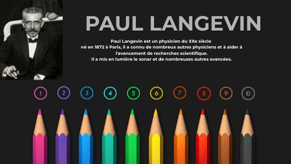 Paul Langevin est un physicien du XXe siècle né en 1872 à Paris, il a connu de nombreux autres physiciens et à aider à l'avancement de recherches scientifique. Il a mis en lumière le sonar et de nombreuses autres avancées.