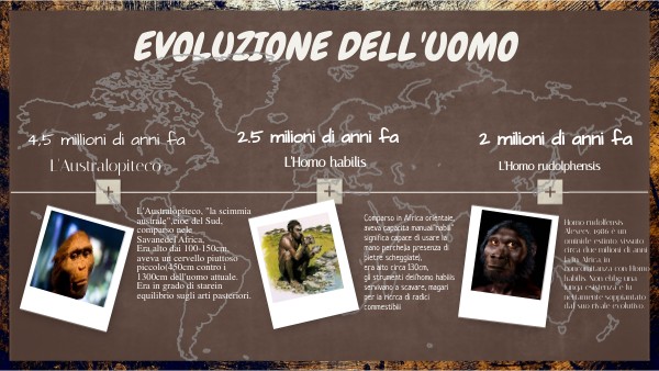 L'Australopiteco, "la scimmia australe",cioe del Sud, comparso nele Savanedel'Africa, Era alto dai 100-150cm, aveva un cervello piuttoso piccolo(450cm contro i 1300cm dell'uomo attuale. Era in grado di starein equilibrio sugli arti pasteriori.