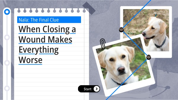 Name: Nala Species: Canine | Breed: Labrador retriever Sex: Female | Age: 7 year old Reason for consultation: A 7-year-old Labrador retriever was treated for a dog-bite wound on the left flank 16 hours post injury. The wound was closed immediately without significant debridement. Six days later, the patient returns to the clinic with a painful, swollen wound that is partially dehisced.