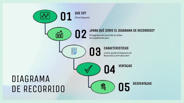 Diagrama de Recorrido Visual: Se apoya en planos o layouts del área de trabajo. Secuencial: Muestra el orden de actividades o movimientos. Codificado: Usa símbolos estándar para representar operaciones, transportes, inspecciones, demoras y almacenamientos. Direccional: Usa flechas para indicar el sentido del recorrido. Medible: Puede registrar distancias recorridas y tiempo invertido. El diagrama de recorrido es una herramienta fundamental en producción y logística, ya que permite analizar y optimizar el flujo de materiales, personas o procesos, mejorando así la eficiencia, productividad y reducción de costos. ¿Qué logra en producción? Elimina pasos innecesarios o mal ubicados. Mejora la distribución de áreas de trabajo. Reduce tiempos de desplazamiento. Facilita el rediseño de procesos para hacerlos más fluidos.