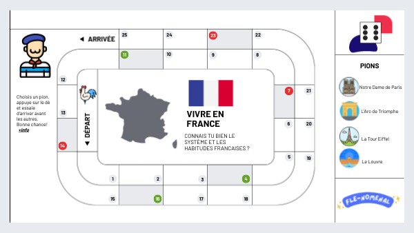 Ce jeu peut être joué de 2 à 4 joueurs. Chaque joueur doit choisir un pion (Notre-Dame, l'Arc de Triomphe, la Tour Eiffel ou Le Louvre) et appuyer sur le dé. Le joueur qui fait le plus grand numéro est le premier à commencer le jeu. Pour jouer, chaque participant doit lancer le dé et bouger son pion dans la bonne case. Pour voir la question, il faut appuyer sur le numéro de la case correspondante. Chaque case correspond à une question sur la vie en France. Si la réponse est correcte, le joueur reste sur sa case. Si la réponse est fausse, il recule d'une case et c'est directement au tour du joueur suivant. Si la question a déjà été posée, avance d'une case et répond à cette nouvelle question. Sur le plateau, il y a aussi 6 cases spéciales (avec les numéros en vert ou en rouge). Si le joueur tombe sur l'une de ces cases, il doit suivre ce qui est inscrit dans la bulle. Le joueur qui atteint le premier la ligne d'arrivée gagne le jeu.