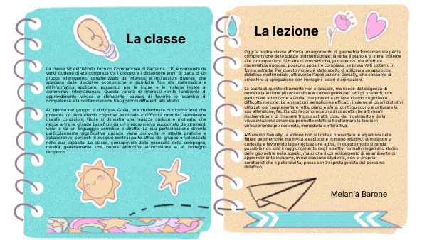 Oggi la nostra classe affronta un argomento di geometria fondamentale per la comprensione dello spazio tridimensionale: la retta, il piano e la sfera, insieme alle loro equazioni. Si tratta di concetti che, pur avendo una struttura matematica rigorosa, possono apparire complessi se presentati soltanto in forma astratta. Per questo motivo è stato scelto di utilizzare un approccio didattico multimediale, attraverso l’applicazione Genially, che consente di arricchire la spiegazione con immagini, colori e animazioni. La scelta di questo strumento non è casuale, ma nasce dall’esigenza di rendere la lezione più accessibile e coinvolgente per tutti gli studenti, con particolare attenzione a Giulia, che presenta un lieve ritardo cognitivo e difficoltà motorie. Le animazioni semplici ma efficaci, insieme ai colori distintivi utilizzati per rappresentare retta, piano e sfera, contribuiscono a catturare la sua attenzione, facilitando la comprensione di concetti che altrimenti rischierebbero di rimanere troppo astratti. L’uso del movimento e della visualizzazione dinamica permette infatti di trasformare la teoria in un’esperienza più concreta, immediata e interattiva. Attraverso Genially, la lezione non si limita a presentare le equazioni delle figure geometriche, ma invita a esplorarle in modo intuitivo, stimolando la curiosità e favorendo la partecipazione attiva. In questo modo si rende possibile non solo il raggiungimento degli obiettivi formativi legati allo studio della geometria nello spazio, ma anche il consolidamento di un ambiente di apprendimento inclusivo, in cui ciascuno studente, con le proprie caratteristiche e potenzialità, possa sentirsi protagonista del percorso didattico.