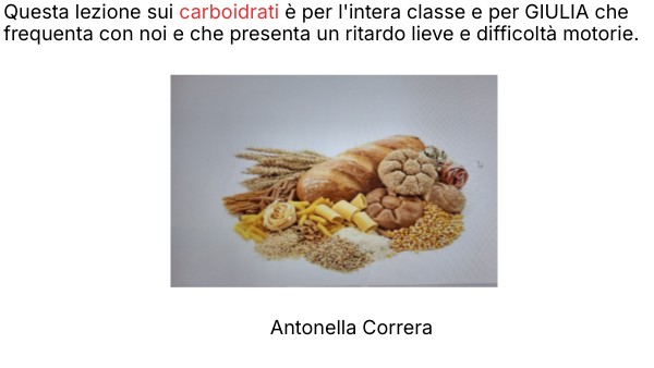 Questa lezione sui carboidrati è per l'intera classe e per GIULIA che frequenta con noi e che presenta un ritardo lieve e difficoltà motorie.