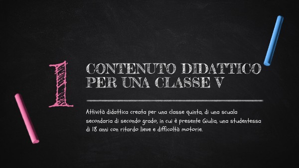 Attività didattica creata per una classe quinta, di una scuala secondaria di secondo grado, in cui è presente Giulia, una studentessa di 18 anni con ritardo lieve e difficoltà motorie.