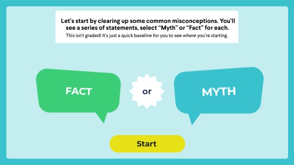 Let’s start by clearing up some common misconceptions. You’ll see a series of statements, select “Myth” or “Fact” for each.