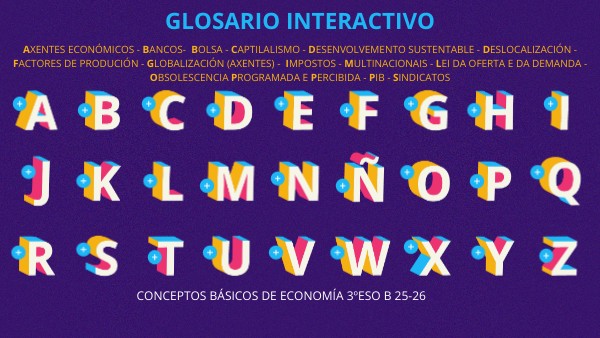AXENTES ECONÓMICOS - BANCOS- BOLSA - CAPTILALISMO - DESENVOLVEMENTO SUSTENTABLE - DESLOCALIZACIÓN -FACTORES DE PRODUCIÓN - GLOBALIZACIÓN (AXENTES) - IMPOSTOS - MULTINACIONAIS - LEI DA OFERTA E DA DEMANDA -OBSOLESCENCIA PROGRAMADA E PERCIBIDA - PIB - SINDICATOS