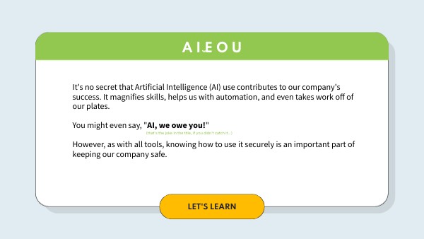 It's no secret that Artificial Intelligence (AI) use contributes to our company's success. It magnifies skills, helps us with automation, and even takes work off of our plates.You might even say, "AI, we owe you!"However, as with all tools, knowing how to use it securely is an important part of keeping our company safe.