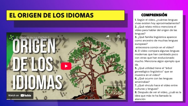 1. Según el vídeo, ¿cuántas lenguas vivas existen hoy aproximadamente? 2. ¿Qué relato mítico menciona el vídeo para hablar del origen de las lenguas? 3. ¿Qué familia lingüística aparece como ancestro de muchas lenguas europeas? antecesora común en el vídeo? 4. El vídeo compara algunas lenguas modernas que han cambiado poco con otras que han evolucionado mucho. Menciona algún ejemplo que da. 5. ¿Qué utilidad tiene el “árbol genealógico lingüístico” que se muestra en el vídeo? 6. ¿Qué ocurre con las lenguas amerindias? 7. ¿Qué vínculo hace el vídeo entre culturas y lenguas? 8. Después de ver el vídeo, ¿cuál es la idea que más te ha llamado la atención