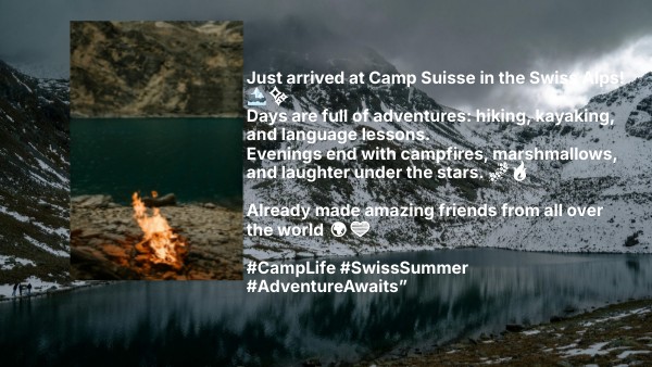 Just arrived at Camp Suisse in the Swiss Alps! 🏔️✨ Days are full of adventures: hiking, kayaking, and language lessons. Evenings end with campfires, marshmallows, and laughter under the stars. 🌌🔥 Already made amazing friends from all over the world 🌍💙 #CampLife #SwissSummer #AdventureAwaits”