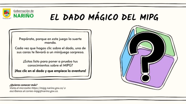 Prepárate, porque en este juego la suerte manda. Cada vez que hagas clic sobre el dado, una de sus caras te llevará a un minijuego sorpresa. ¿Estas listo para poner a prueba tus conocimientos sobre el MIPG? ¡Haz clic en el dado y que empiece la aventura!