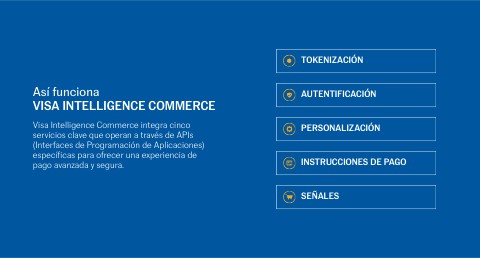 Visa Intelligence Commerce integra cinco servicios clave que operan a través de APIs (Interfaces de Programación de Aplicaciones) específicas para ofrecer una experiencia de pago avanzada y segura.