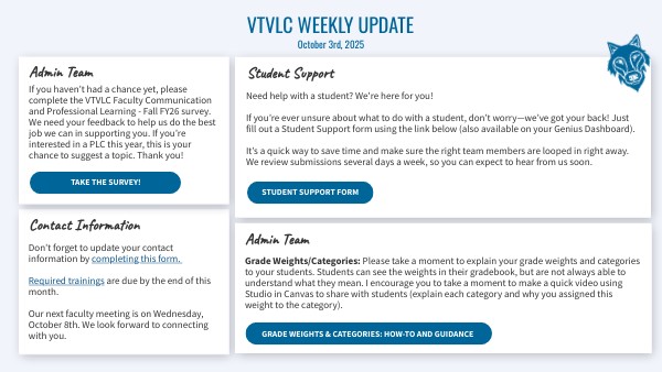 If you haven’t had a chance yet, please complete the VTVLC Faculty Communication and Professional Learning - Fall FY26 survey. We need your feedback to help us do the best job we can in supporting you. If you’re interested in a PLC this year, this is your chance to suggest a topic. Thank you!