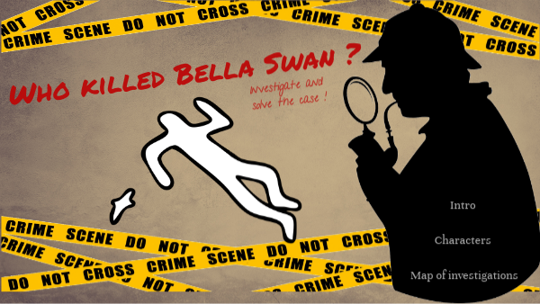 Yesterday afternoon, someone strangled Bella Swan between 3 P.M and 5 P.M. in the school library. Nine characters, all really bad people well known for their judiciary record, could have commit this terrible act.