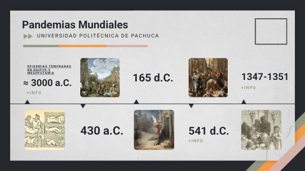 Posible viruela llevada por soldados. Causó millones de muertes.Influencia: debilitó al Imperio Romano y facilitó su crisis posterior.