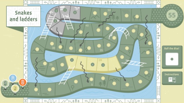 Players start with a token - which represents each of them - in the initial square and take turns rolling the die. The tokens move according to the numbering on the board, in ascending order. If, at the end of a move, a player lands on a square where a ladder begins, they move up it to the square where it ends. If, on the other hand, they land on a square where a snake's tail begins, they move down it to the square where its head ends. If a player rolls a 6, they can move twice in a single turn. If a player rolls three consecutive 6's, they must return to the initial square and cannot move their token until they roll a 6 again. The player who reaches the final square is the winner. There is a variation where, if a player is six or fewer squares away from the end, they must roll precisely the number needed to reach it. If the number rolled exceeds the number of remaining squares, the player cannot move.