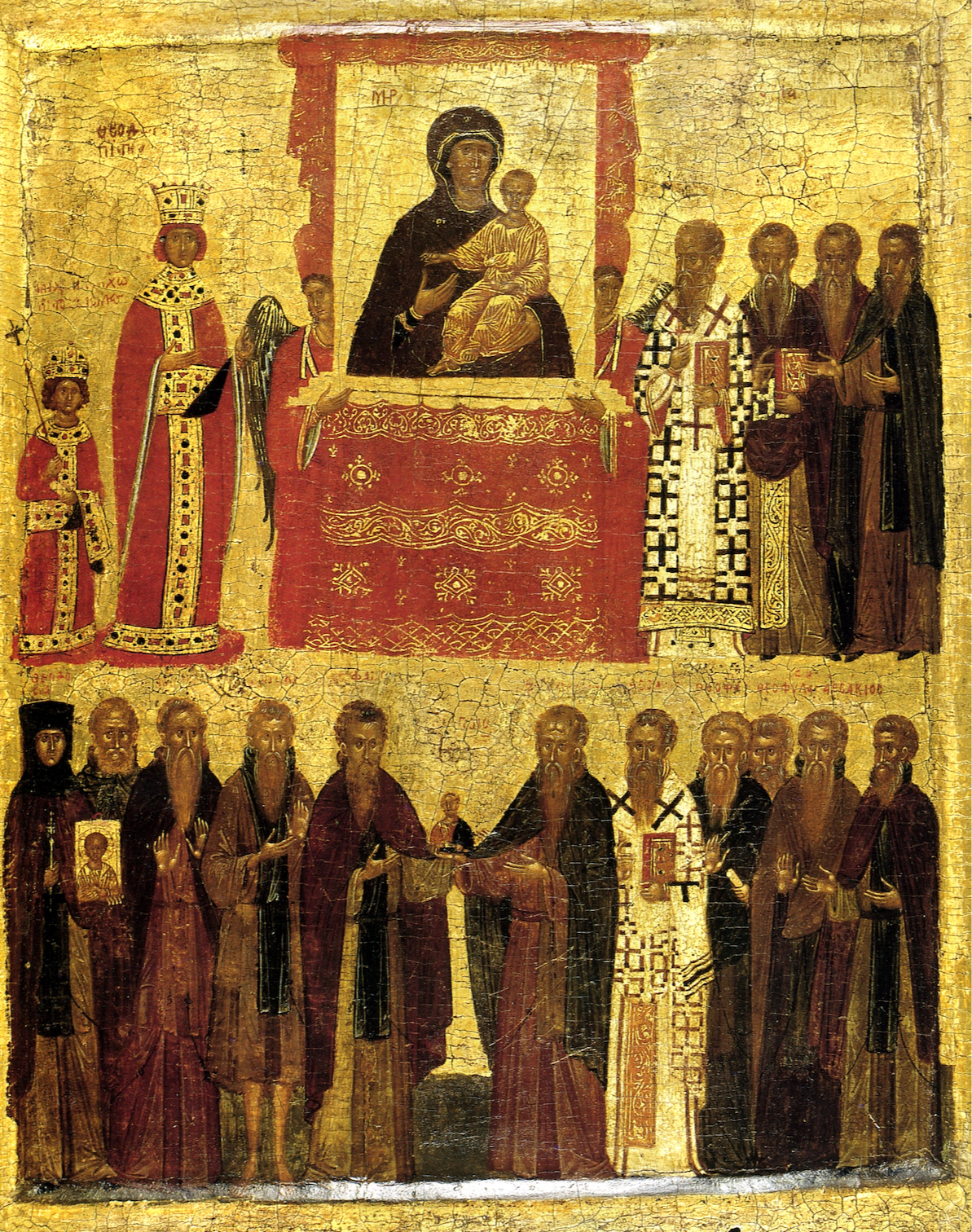 The subject of this icon is the commemoration of the first feast of the Triumph of Orthodoxy, on the first Sunday of Lent in 843. This day celebrates the defeat of iconoclasm and the triumph of the use of icons and religious imagery again. In the center of the upper half of the icon is Theotokos Hodegetria, or Virgin Mary holding her baby Jesus. Theotokos has her hand pointed towards Jesus which can be interpreted as her presenting him to the world as the baby’s hand is facing down, generally regarded as a sign of blessing. Mary and Jesus stand much larger than the other figures in the painting, possibly suggesting a connection between Mary and divinity. They stand within a red, curtained booth with two guards, potentially guardian angels by their wings, that blend into the curtains. To the left of Mary is Empress Theodora and her son Michael III. To the right of Hodegetria is Patriarch Methodios - an important figure in ending Iconoclasm - Bishop Theodore, and two monks. The lower register contains a group of saints and monks including, St. Theodosia on the left holding an Icon of Christ. To the right of St. Theodosia is St. Ioannikios then St. Stephanos, also holding an icon of Christ between St. Theodore the Studite, then St. Theodore, St. Theophanes, St. Theophylaktos, and lastly St. Arsakios. The saints appear to be celebrating the Iconoclasm and there are some red inscriptions above the figures but they are pretty faded.