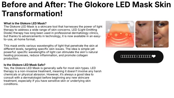 What is the Glokore LED Mask? The Glokore LED Mask is a skincare tool that harnesses the power of light therapy to address a wide range of skin concerns. LED (Light Emitting Diode) therapy has long been used in professional dermatology clinics, but thanks to advancements in technology, it is now available in an easy-to-use, at-home format. This mask emits various wavelengths of light that penetrate the skin at different levels, targeting specific skin issues. The idea is simple yet powerful: specific wavelengths of light can stimulate the skin's natural healing processes, reduce inflammation, and promote collagen production. Is the Glokore LED Mask Safe? Yes, the Glokore LED Mask is generally safe for most skin types. LED therapy is a non-invasive treatment, meaning it doesn't involve any harsh chemicals or physical abrasion. However, itβs always a good idea to consult with a dermatologist before beginning any new skincare treatment, especially if you have sensitive skin or underlying skin conditions.