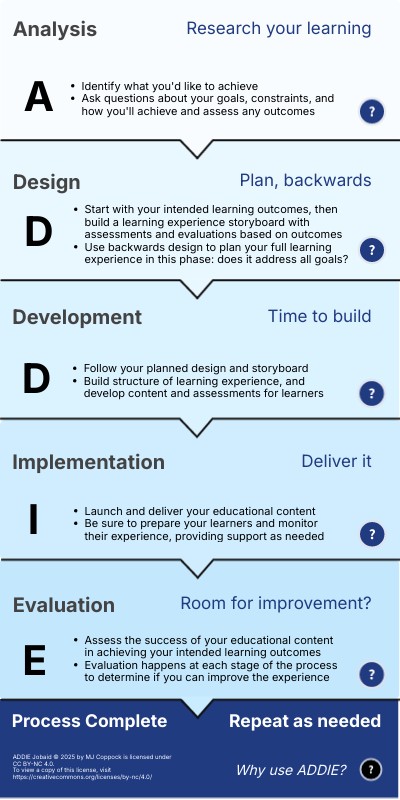 ADDIE Jobaid © 2025 by MJ Coppock is licensed under CC BY-NC 4.0. To view a copy of this license, visit https://creativecommons.org/licenses/by-nc/4.0/