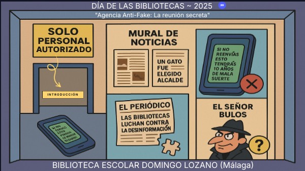 El día 24 de octubre se celebra el Día de las Bibliotecas. Este año tiene como lema: "Contra la desinformación: bibliotecas", para destacar el papel de las bibliotecas en la lucha contra la información falsa a través de recursos fiables y el apoyo del personal bibliotecario. Recientemente, los usuarios de nuestra Biblioteca Escolar han detectado que el señor Bulos quiere boicotear la celebración y está llenando el colegio de noticias falsas. Se esconden en carteles, mensajes de móvil, páginas web… Si no se le detiene a tiempo, nadie sabrá qué es verdad y qué es mentira. Ahora formas parte de la Agencia Anti-Fake, un equipo secreto cuya misión es descubrir los bulos y las mentiras que están llenando de confusión a todo el colegio. Deberás llegar a la Sala Meet para asistir a una reunión de alto secreto donde se decidirá cómo detener al señor Bulos. Para entrar deberás completar las misiones e introducir un código de cuatro dígitos. El objetivo es proteger la biblioteca como lugar de conocimiento.