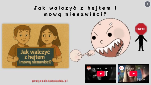 Krótki quiz ustny – nauczyciel zadaje pytania sprawdzające: „Co to jest hejt? Wymień dwa skutki hejtu. Co należy zrobić, gdy widzisz hejt?” itp. Ewaluacja – uczniowie oceniają lekcję, podnosząc kciuk w górę (podobała się) lub poziomo (było ok) albo w dół (nie podobała się). Nauczyciel prosi chętnych o krótkie wyjaśnienie. Zakończenie – podkreślenie, że każdy może przyczynić się do ograniczania hejtu przez szacunek i odwagę reagowania. Zachęta do zapoznania się z plakatem klasowym powstałym z haseł grup.