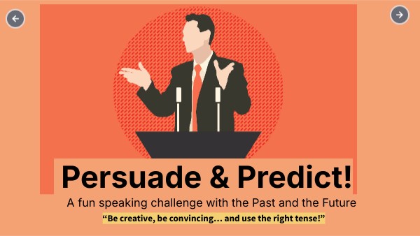 Il primo partecipante inizia la storia con una frase usando Past o Future. Esempio: “Yesterday, I found a mysterious suitcase on my doorstep.” Il secondo partecipante aggiunge una frase continuando la storia. Esempio: “Inside, there was a map to a hidden garden.” Ogni partecipante continua a turno, aggiungendo una frase alla volta.