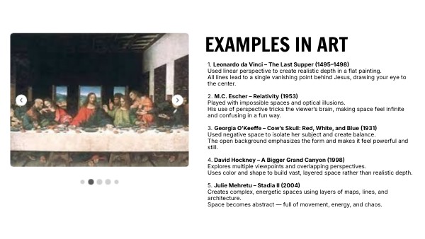 1. Leonardo da Vinci – The Last Supper (1495–1498) Used linear perspective to create realistic depth in a flat painting. All lines lead to a single vanishing point behind Jesus, drawing your eye to the center. 2. M.C. Escher – Relativity (1953) Played with impossible spaces and optical illusions. His use of perspective tricks the viewer’s brain, making space feel infinite and confusing in a fun way. 3. Georgia O’Keeffe – Cow’s Skull: Red, White, and Blue (1931) Used negative space to isolate her subject and create balance. The open background emphasizes the form and makes it feel powerful and still. 4. David Hockney – A Bigger Grand Canyon (1998) Explores multiple viewpoints and overlapping perspectives. Uses color and shape to build vast, layered space rather than realistic depth. 5. Julie Mehretu – Stadia II (2004) Creates complex, energetic spaces using layers of maps, lines, and architecture. Space becomes abstract — full of movement, energy, and chaos.