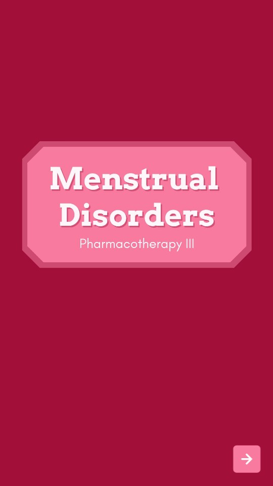This self-assessment study guide has 2 questions, each written using learning objectives from your Menstruation Disorders lecture. Not all learning objectives are covered. Participation/scores are not monitored. FYI this program makes noise sometimes.